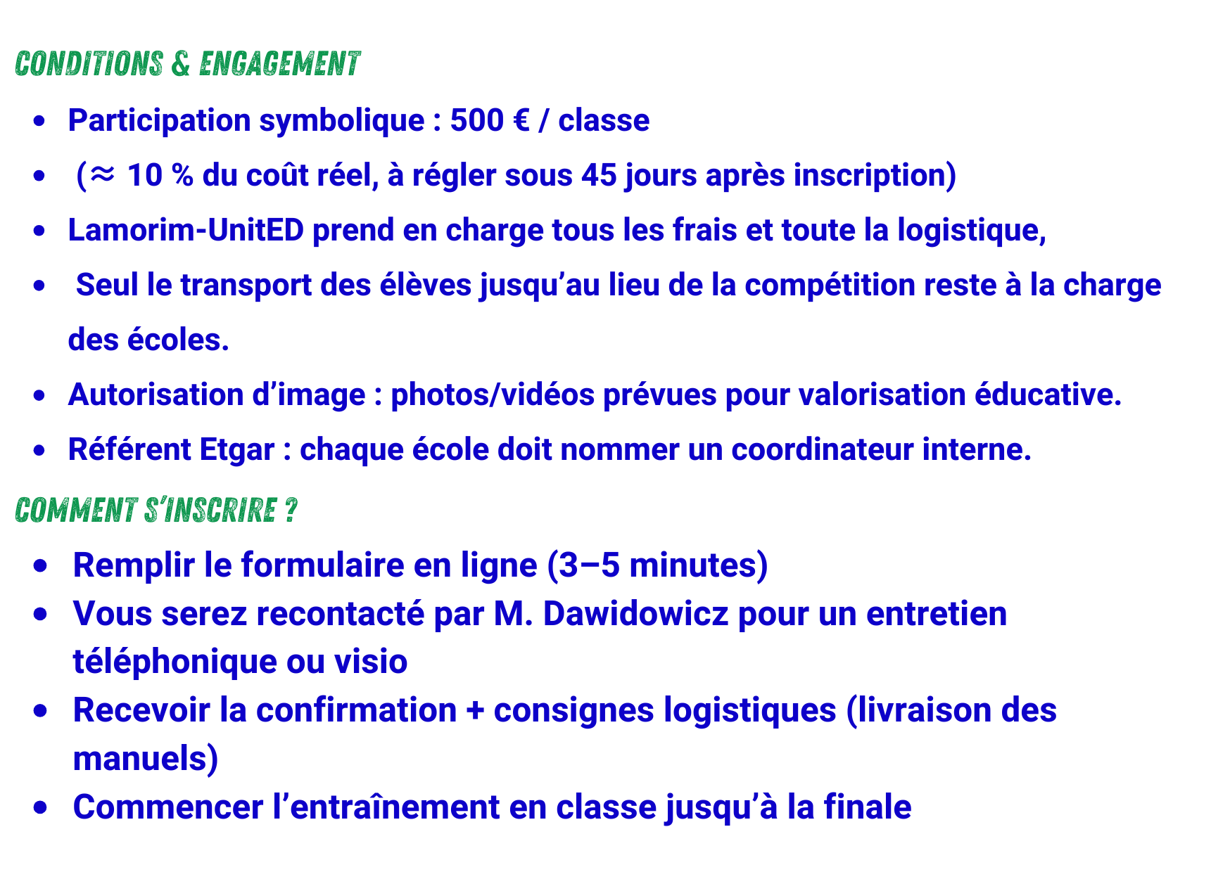 La participation de 500 € / classe est due sous 45 jours après inscription (virement ou chèque). Les infos de facturation sont demandées dans le formulaire.